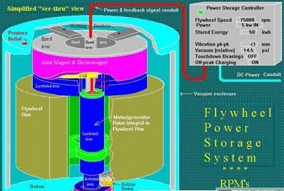 1994年,美國阿貢(ANL)國家實驗室用碳纖維試制一個儲能飛輪:直徑38厘米,質量為 11千克,采用超導磁懸浮,飛輪線速度達1000米/秒。它儲的能量可將10個100瓦燈泡點燃2~5小時。該實驗室目前正在開發儲能為50千瓦小時的儲能輪,最終目標是使其儲能達5000千瓦小時的儲能飛輪。一個發電功率為100萬千瓦的電廠,約需這樣的儲能輪200個。