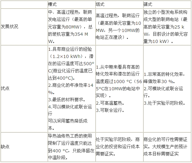 表2-1 三種聚光式太陽能電站的發(fā)展?fàn)顩r及其優(yōu)缺點(diǎn)
