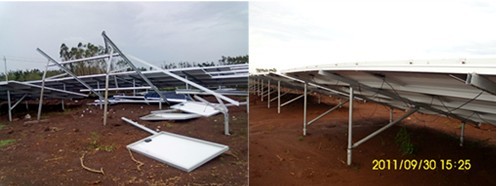 在2011年9月,我國海南省經受了“納沙”臺風襲擊,地處臺風中心的部分地面光伏發電站光伏支架被臺風破壞,發生傾覆,更為嚴重的是有些螺旋樁基礎也被強大的風力連根拔起,與光伏支架脫離,給客戶造成了損失。據了解,螺旋樁從外形上區分主要分為兩種:1.連續形螺旋葉片;2.兩個或多個有間隔螺旋葉片。而在這次臺風襲擊中這部分遭到破壞的地面光伏電站均應用了連續形窄葉片的螺旋樁支架基礎,可同樣處于風災中心地區的另一光伏電站項目,光伏支架基礎全部采用適用于當地地質條件的有間隔雙葉片的螺旋樁,螺旋樁與支架無一發生損壞。這就驗證了單純的模仿難以保證太陽能發電項目的安全。