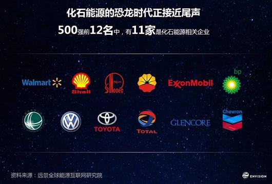 如果我們把視野轉到我們的經濟社會,2015年的500強前12名當中,你會發現有11家是化石能源相關的企業,其中9家是化石能源的生產和交易商。
