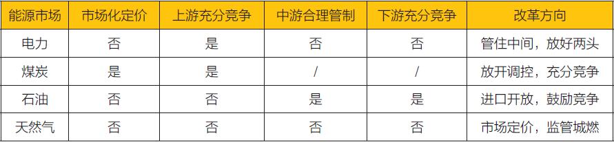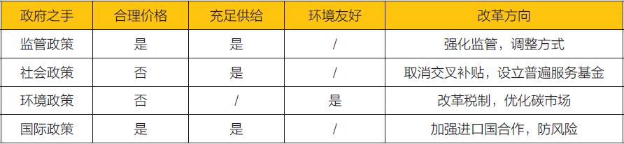 第一步是建設現代能源體系,實現能源領域效率前沿。市場化建設和合理監管是實現效率最大化的兩個抓手。首先,在競爭性領域,讓市場起決定性作用。因此,建設“能源市場之制”始終是效率最大化的基礎。除此以外,能源市場自身性質決定市場失靈多發且嚴重:能源輸配存在自然壟斷性質,能源消費產生外部性,國際能源供給呈現公共物品性質,等等。糾正市場勢力就需要合理運用“政府之手”實施有效監管。中國能源體系的現狀和改革方向如下表10所示。