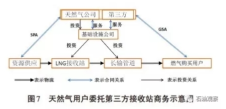 (2)第三方委托加工模式該模式類似歐洲天然氣改革后的進口模式,也是在中國實施《油氣管網設施公平開放監管辦法(試行)》框架下的商務模式,第三方以委托形式,委托 建設經營管理的LNG接收站、輸氣管線的基礎設施公司(如接收站項目公司)提供LNG接收、存儲、汽 化、管輸天然氣服務。同時直接與資源供應商簽訂資源供應合同(SPA),與燃氣購買用戶簽訂天然氣銷售協議(GSA),如圖7所示。
