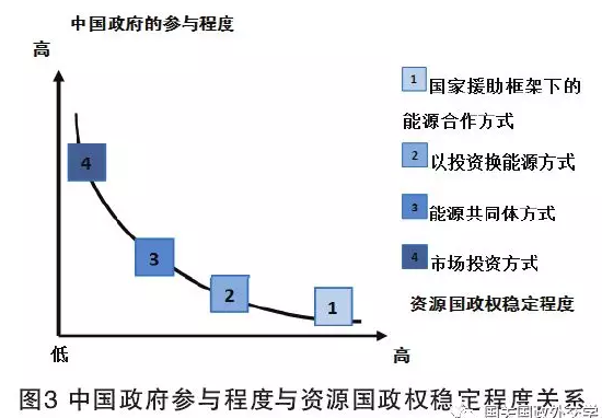 資源國政權的穩定程度與中國政府參與方式及程度反向相關。在國家援助框架下的能源合作中,中國政府的參與程度最高,資源國政權掌控力越弱;以投資換能源方式中,中國政府參與程度較高,資源國政府穩定程度較弱;能源共同體方式中,中國政府參與程度較低,資源國政府穩定程度較強;市場投資方式中,中國政府參與程度最低,資源國政府穩定程度最強。具體關系如圖3所示。