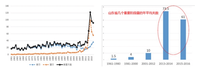 圖3、2000-2016年山東省氣象霧霾日變化趨勢(shì)。其中,藍(lán)線代表霧日,紅線代表霾日,黑線代表霧霾日。