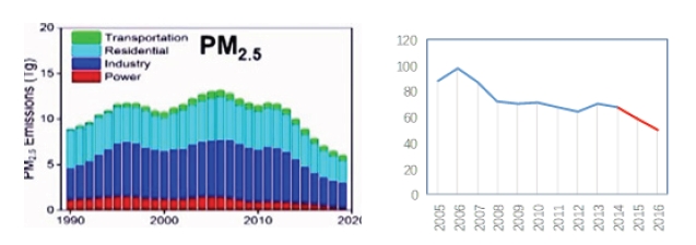 治理的三項(xiàng)常規(guī)污染物中,二氧化硫、氮氧化合物原本治理目標(biāo)是酸雨治理,煙粉塵原本治理目標(biāo)是TSP懸浮顆粒物。以燃煤電廠為例,這些指標(biāo)物排放量均比峰值下降90%以上,治理成效顯著。為什么治理后,霧霾狀況反而不如PM2.5高峰期間的2006年呢?