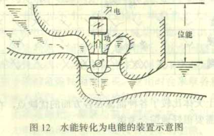 水能利用主要是利用水的位能,水位高,水的位能也大。另外也可以從地心吸力來解釋,即地球對水有吸力,水從高處向下流,經過水輪機發出機械功(參看圖12)。水輪機的輪子上裝有很多葉片,水流過葉片時就使輪子轉動,再通過驅動軸轉動發電機發電。像這種動力機械的輪子上裝有葉片的統稱為葉輪機械,葉輪機械不僅用于水輪機上,在蒸汽輪機上也用這種形式的動力機械,蒸汽流過葉片時轉動輪子,帶動發電機。在燃氣輪機中則是燃燒后的氣體流過葉片轉動輪子。另外一種類型的動力機械是活塞式發動機,氣缸里有活塞、燃燒后的熱氣在氣缸內膨脹,推動活塞,活塞再通過連桿帶動曲柄,使它轉動,對外作功。