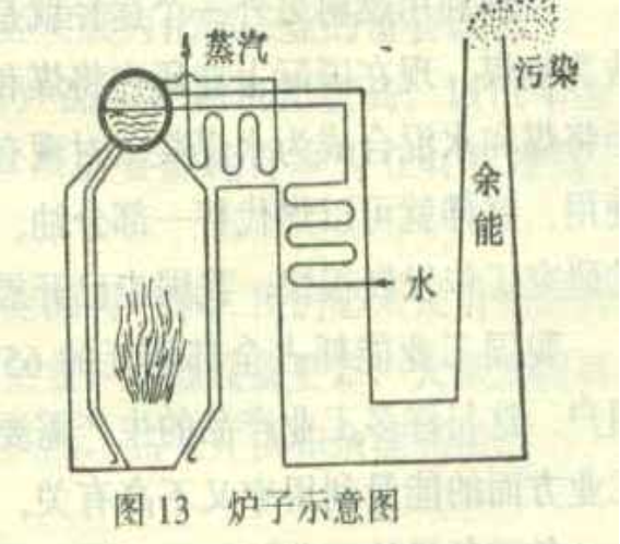 一般常規燃料是通過熱的形式來使用。通常各種燃料的化學能(或原子能)都要在各式各樣的爐子(或反應堆)中轉化為熱(圖13)。熱可以直接使用,以滿足各種工藝流程和生產的需要;熱也可以通過熱機、電機等進一步轉化為機械能、電能,然后再被使用。經過熱這個環節而被利用的能量,在我國占90%以上,世界各國平均也超過85%。因此,研究提高各種爐子的轉化效率是有普遍指導意義的。