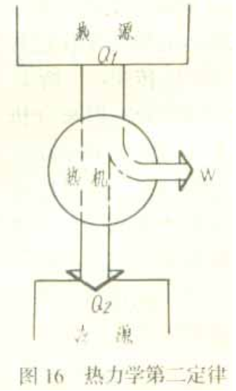 除了第一定律以外,分析熱機很重要的是熱力學第二定律,能源充分利用與否還要用熱力學第二定律。下面用圖16來說明熱力學第二定律。