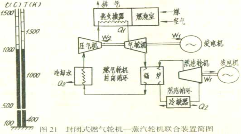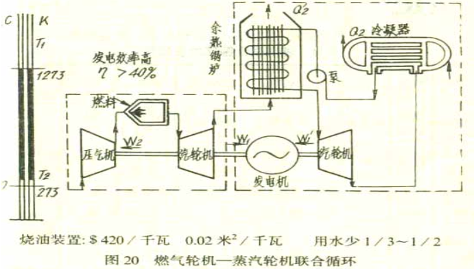 燃氣輪機又可以與蒸汽輪機聯合起來,成為一個聯合循環裝置。圖20、21是燃氣輪機和蒸汽輪機聯合裝置的示意圖。