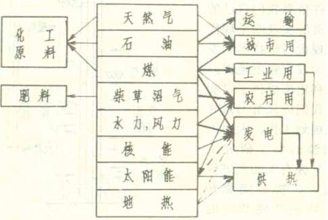圖8表示各種能源經過各種設備把它們轉化為各種不同形式的能來使用。圖的左邊是各種能源,右邊是各種使用形式,中間是各種轉化過程。從上面往下,天然氣、石油、煤、有機物(如薪炭、農作物秸稈)都是常規能源,水力和風力也算是常規能源。