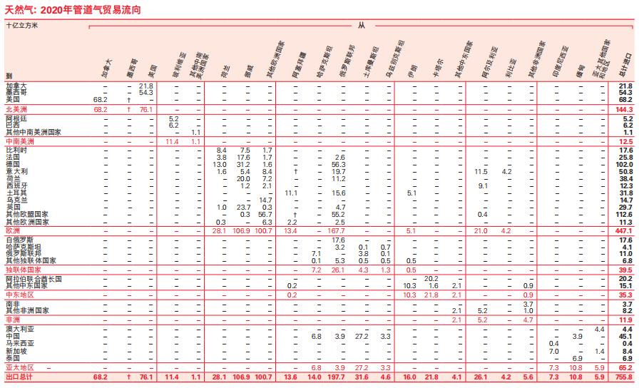 天然氣方面,2020年,俄羅斯向歐洲出口的管道氣占自身出口量的84.8%,達到1677億方,該氣量占歐洲管道氣進口量的37.5%。另外,俄羅斯向歐洲的液化天然氣出口量為172億方,占歐洲LNG進口量的15%。