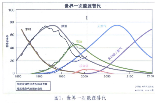 事實上,過去150多年的歷史告訴我們,能源體系在沒有政策干預的情況下,將會呈現“固體——液體——氣體”這樣一條平穩、自然的進化曲線(如圖2),其顯著特征就在于“去碳化”的過程:從煤炭(分子式為C135H96O9NS)到石油(從C5H12到C36H74)再到天然氣(CH4)甚至是氫氣(H2)——即從最不清潔的、化學結構最復雜的能源所提供的高度資本密集型的、集中的、宏觀的、不可移動的和低效的能源技術,逐漸發展為越來越清潔的、化學結構越來越簡單的能源所提供的非資本密集型的、相對分散的、微觀的、易于移動的、高效的能源技術。因此我們完全有理由也有必要相信并堅持業已觀察到的發展趨勢。