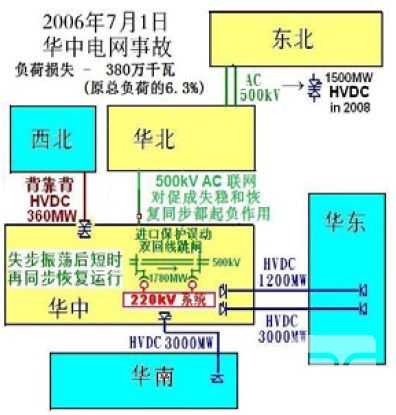 按圖5所示的中國電網結構所示六大區基本都僅用直流聯網,就完全避免連鎖反應, 很安全,是從不會發生重大停電的原因之一。