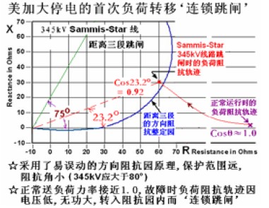 世界最嚴重的2003年美加大停電,在線路故障跳閘而將負荷轉移到并列的線路時,很易造成距離保護過負荷跳閘,圖3就表達了跳閘的過程,負荷轉移時,不旦增有功而且增無功電力,使美/印應用的方向阻抗易過負荷跳閘。