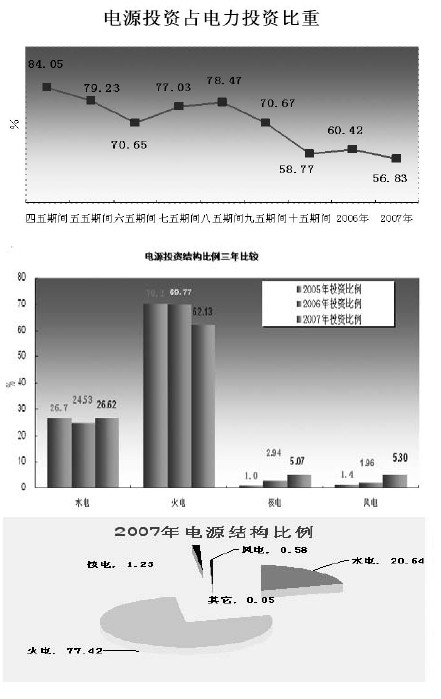 從投資的角度說(shuō),我剛才第四個(gè)結(jié)論,電源的結(jié)構(gòu)發(fā)生了變化。從2007年大家可以看到,電源投資同比增長(zhǎng)7.36%,遠(yuǎn)遠(yuǎn)低于全國(guó)的數(shù)據(jù)。但是在這里面我們的結(jié)構(gòu)發(fā)生了根本性的變化,水電同比增長(zhǎng)了9.6%,同比增加了18個(gè)百分點(diǎn)。這種大幅度增長(zhǎng)也是近幾年的事情,因?yàn)楝F(xiàn)在我們的2007年的數(shù)據(jù)還體現(xiàn)了三峽、龍灘等大機(jī)組的、大的在建的建設(shè)項(xiàng)目。還有剛剛開(kāi)工的溪洛渡、向家壩等剛投入的項(xiàng)目,當(dāng)然還有一批中小的電站,2007年體現(xiàn)了比較高的水電的增長(zhǎng)。特別是要關(guān)注的,我們火電增長(zhǎng)同比是負(fù)增長(zhǎng),-10.08%,回落8.26個(gè)百分點(diǎn)。我認(rèn)為這種增長(zhǎng)方式和增長(zhǎng)趨勢(shì)也是符合了目前新的變化規(guī)律。這種趨勢(shì)還會(huì)繼續(xù)延續(xù)下去,核電、風(fēng)電保持了高速的增長(zhǎng),核電同比增長(zhǎng)73.98%,有一些目前還沒(méi)有完全開(kāi)工,正在進(jìn)行前期準(zhǔn)備的項(xiàng)目。風(fēng)電同比增長(zhǎng)了173.94%,從這樣的數(shù)據(jù)當(dāng)中可以看到一個(gè)問(wèn)題,我們的電源結(jié)構(gòu),下一步投產(chǎn)的結(jié)構(gòu)發(fā)生的變化。