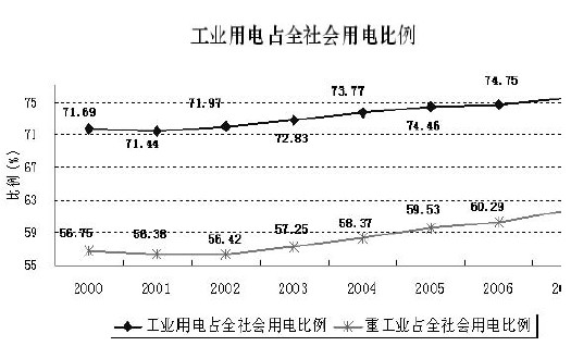 正因?yàn)橛辛诉@三周期的資源輸出性的周期,我們的用電結(jié)構(gòu)變化非常厲害,尤其是2004年達(dá)到了1.53的水平。改革開(kāi)放之前也很高,但是那個(gè)時(shí)期談不上規(guī)律,完全短缺、完全是政府的手在起作用。以后是真正的市場(chǎng)在說(shuō)話,這個(gè)時(shí)候反應(yīng)了我們的結(jié)構(gòu)規(guī)律基本上大于1的狀況。大于1誰(shuí)在起作用,真正拉動(dòng)電力消費(fèi)主要是5大行業(yè),一個(gè)是電力自己。電力占了電力消費(fèi)排名第一,占了整個(gè)全社會(huì)用電量的14%。這里面包含了線損和廠用電率,所以電力確實(shí)是高耗能,但是跟煤炭轉(zhuǎn)化又是一個(gè)概念。排名第二的是鋼鐵,用電量占全國(guó)用電量11%,第三位是化工、有色、建材。但是在這些過(guò)程當(dāng)中,真正拉動(dòng)電力消費(fèi)起來(lái)的是黑色和有色,增長(zhǎng)速度非常快。整個(gè)拉起來(lái)了,2006年、2007年增長(zhǎng)很快,是它們起了作用,尤其是2007年有色價(jià)格非常好,所以鋼鐵、有色起了大幅度增長(zhǎng)的過(guò)程,同比增長(zhǎng)了30%多,把整個(gè)拉了起來(lái)。這是這一兩年電力消費(fèi)的根本性的規(guī)律,所以,是高耗能資源輸出型在拉動(dòng),這樣的情況下,我們電力工業(yè)用電比例非常高。這個(gè)比例非常高,確實(shí)是我國(guó)目前的經(jīng)濟(jì)階段,比如說(shuō)美國(guó)的工業(yè)電40%到50%,居民用電40%。而我們工業(yè)用電75%,居民用電11%,從這樣的結(jié)構(gòu)看,我國(guó)目前的經(jīng)濟(jì)水平、經(jīng)濟(jì)結(jié)構(gòu)跟國(guó)外確實(shí)相差很遠(yuǎn)。尤其是省間平衡、省間的差距更大,比如說(shuō)西北地區(qū),高耗能行業(yè)所在比較大的青海、寧夏、內(nèi)蒙,工業(yè)用電占了90%,這些省份全部是靠重工業(yè),有的地區(qū)基本上靠挖了煤、建了礦,建了電,把污染留給自己,這樣的狀況下完成的,他們的結(jié)構(gòu)確實(shí)不合理。