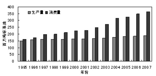 圖2 我國(guó)石油的年產(chǎn)量和消費(fèi)量1995–2007
