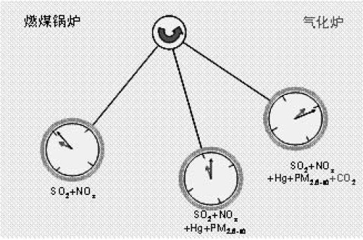 3)污染物的排放降到最低,如SO2、NOx、PM2.5-10、Hg、CO2等。在環(huán)保要求日益嚴(yán)格的條件下,從燃煤鍋爐逐步過渡到氣化爐,在不同時(shí)間段實(shí)現(xiàn)不同污染物的減排(如圖5)。當(dāng)僅僅減排SO2和NOx時(shí),采用燃煤鍋爐具有較好的經(jīng)濟(jì)性,若進(jìn)一步要求減排Hg、PM2.5-10,甚至CO2,則煤氣化多聯(lián)產(chǎn)將在經(jīng)濟(jì)上更具優(yōu)勢(shì)。