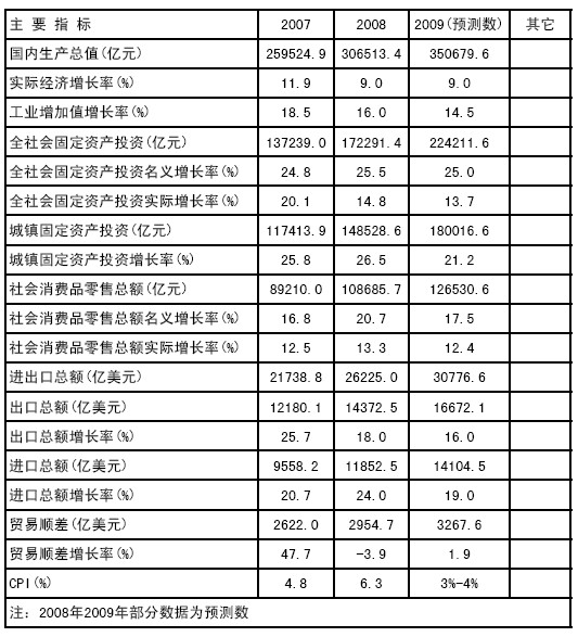 2009年我國面臨的外部環境更加嚴峻,世界經濟面臨衰退的可能性在增大。美國次貸危機仍在繼續向縱深發展,其對美國以及世界經濟的拖累效應仍在不斷擴散。數據顯示,8月份美國新房平均銷售價格創下11.8%的歷史最大跌幅,新房銷售中間價下降5.5%,積壓待售新房數量為40.8萬套。按當月銷售速度,需要10.9個月才能售完,顯示美國房地產市場仍處于深度疲軟狀態;消費者信心指數6月份跌至50.4,為1992年以來最低點;失業率上升至5.5%,為2004年10月以來的最高點。美聯儲預計,今年美國經濟增長速度僅0.3%-1.2%,失業率將達到5.5%-5.7%。近期美國五大投行中有三大投行接連宣布破產,尤其是有百年以上歷史的雷曼兄弟破產,引發全球股市暴跌,表明次貸危機的影響遠沒有結束,有可能持續到2009年甚至更長時間。美聯儲前主席格林斯潘認為,“這場危機引發經濟衰退的可能性正在增大,危機還將誘發全球一系列經濟動蕩。”