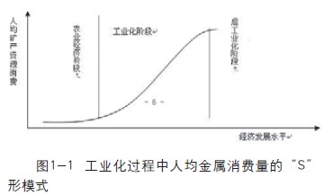 先期工業化國家經濟增長與金屬消費需求的理論和經驗表明(中國地質科學院全球礦產資源戰略研究中心,2002),人均國內生產總值(GDP)與人均金屬消費量之間存在著很強的相關關系。西方有關學者將其歸納為“S”形模式。該模式認為,在農業社會,金屬的消費量與人均收入增長的關系并不確定,隨著人均收入的增長,經濟發展的重點由農業轉向制造業,礦產資源的人均消耗開始增長,人均收入的進一步增長,消費者需求將成為人均金屬消費量增長的驅動力。并且,一旦人均收入達到一定水平,金屬需求量就會在一定時期內成倍增加,經濟發展到成熟期后,消費增長會保持在一定水平,最后呈下降趨勢,如圖1-1。