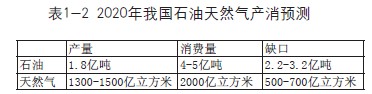 據有關部門預測,中國未來石油天然氣消費量將繼續增大,2020年石油缺口將在2.2億噸—3.2億噸,天然氣缺口將為500億—700億立方米(見表1-2)。我國石油對外依存度將達到60%。