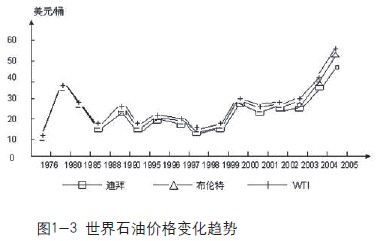 1997年以來,國際石油市場風云變幻,石油價格出現了前所未有的從暴跌到暴漲的劇烈震蕩。由于亞洲金融危機的影響,1998年世界石油供需失衡,油價跌至平均每桶不足10美元;1999年歐佩克石油部長會議達成了減產協議,導致油價從1999年年初的每桶不到10美元一路上漲到年底前的超過25美元;2000年世界石油市場油價持續高位震蕩,全年世界平均油價每桶為28.53美元。2001年受世界經濟下滑以及“9.11”事件等因素的影響,世界油價呈現整體下滑趨勢,全年世界平均油價每桶為24.50美元。2002年受中東局勢、歐佩克和非歐佩克達成減產協議、委內瑞拉石油工人罷工和美國石油庫存以及美國與伊拉克戰爭的影響,國際原油價格持續走高(見圖1-3)。2005年,WTI期貨價格一度沖抵70美元/桶的心理大關。不斷攀升的油價使人們不禁感嘆:世界已經進入了高油價時代!業界普遍認為,高油價的原因絕非是石油資源不足。全球石油需求增長提速、地緣政治的風云變幻、供應鏈的缺陷、抵抗自然災害能力差、投機增多等多種因素均共同導致油價上漲。