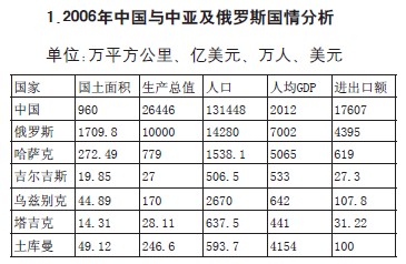2006年,中國與中亞及俄羅斯人口15.16億,實現生產總值37696.7億美元, 占當年全球生產總值的8.1%;對外貿易額22887.3億美元,占當年全球貿易額的9.4%。