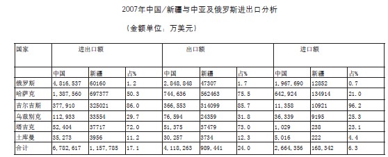 2007年,新疆與中亞及俄羅斯進出口額達115.8億美元,占新疆進出口總值的84.4%,占我國對中亞及俄羅斯貿易額的17.1%。其中,出口98.9億美元,占新疆出口總值的86%,占我國對中亞及俄羅斯出口額的24%;進口16.8億美元,占新疆進口總值的76.1%,占我國自中亞及俄羅斯進口額的6.3%。