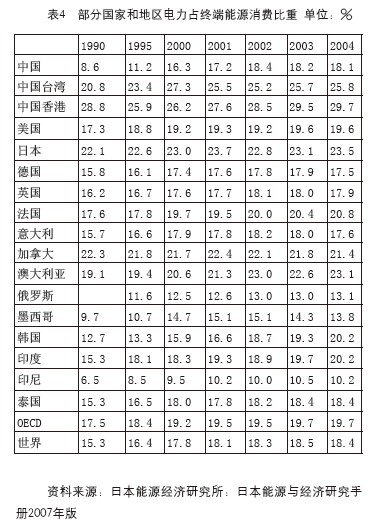 中國過去電力占終端能源消費的比重較低,如1990年中國的比重為8.6%,發達國家(OECD)的比重為17.5%世界為15.3%,中國的電力消費比重確實只有OECD國家的一半。但是到2004年中國的比重為18.1%,發達國家的比重為19.7%,世界為18.4%,中國僅比發達國家低1.6個百分點,與世界平均水平已經很接近了。到2006年中國電力在終端能源消費中的比重已上升到20.31%,考慮發達國家和世界的比重變化不大,估計中國目前的比重已經超過了OECD和世界的比重。具體數據見表4.。這就是說,目前中國電能消耗比重不及發達國家一半,電力消費占終端能源消費比例僅為11%與實際情況不符,如果說差距大,電能替代有較發展空間,那么中國與發達國家沒有什么差距,是否說明電能替代已經不存在發展空間了。我認為這幾年中國電力需求旺盛,從2000年開始到2007年已經持續8年電力消費彈性指數大于1,這果然與中國所處的經濟發展時期有關,但與電力價格比石油、天然氣和煤炭的比價大大偏低也有很大關系,大家都棄柴、煤、油、氣而用電。終端能源消費的比重必然會有較快的上升。
