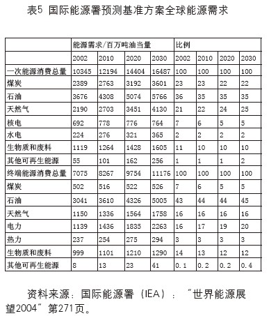 國際能源署對全球能源消費的2004年預測,預測周期至2030年,在一次能源供應總量中石油、天然氣和煤炭等化石能源的年增長率雖不高,但由于其基數大,最后在各個水平年中都占據較大比重;水電和其他可再生能源年增長率很高,但是由于基數較小,最后在各水平年中只占據較小的比重;核電、生物質和廢料年增長率還沒有化石能源高,最后在各水平年中占據的比例也不大。