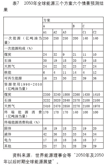 1995年世界能源理事會(WEC)和國際應用系統分析研究所(TTASA)共同完成“2020年及2050年以后時期的全球能源展望”。這項研究的時段長,一直預測到2050年,另一個特點是設定了三個方案,六個情景,A方案是經濟高速發展方案,設定了A1、A2、A3三個情景;B方案是溫和增長方案,只有一種情景;C方案是生態驅動方案,考慮分兩個情景,C1假定核電受公眾壓力發展緩慢,主要依靠可再生能源;C2是依靠可再生能源和核電方案。應當說這個預測考慮得比較周到的,但是各個情景在2050年時全球終端能源消費構成中,電力的比重只有16%~18%,比重也不高。具體數字見表7.
