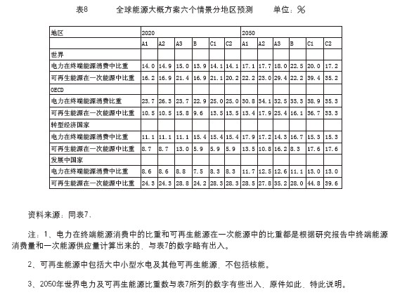 世界能源理事會等的能源預測中,還有過去的預測,我們把2020年和2050年的分區預測的電力占終端能源消費比重和可再生能源比重計算出來,例如表8。從表8中可以看到,發展中國家可再生能源的利用比例要比發達國家(OECD)和轉型經濟國家要高得多,但是,電力在終端能源利用中的比例卻是發達國家最高,轉型經濟國家居中,發展中國家最低。這個資料說明一個問題,當能源利用進入后化石時代,減少化石能源的利用比例,增加可再生能源資源的開發利用比例,電力在終端能源消費中的比例不一定隨之上升,在可再生能源中,如生物質能、太陽能等不一定要轉化成電力來使用,電力在終端能源消費中的比例高低取決于經濟發展水平。