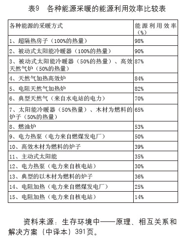 這里需要特別說明的是,不能把終端能源利用效率與通常所說的能源利用效率混為一談。對于電力利用要特別注意這個問題,因為電力的特點是加工、轉換、儲運等中間環節的損失很大,效率很低,而終端的利用效率很高,如果電阻加熱取暖器效率為90%,比其他任何能源加熱器都要高,如果用這個效率來評價電力,那么電力的效率很高,但是電力考慮中間環節效率之后,則真正的能源利用效率卻是極低的。從科學用能、合理用能來講,我們應當提倡熱電聯產(CHP),冷熱電聯產(CCHP)而不應當提倡電阻式電鍋爐,電阻式電暖氣、電淋浴器、電開水器等。下面用一張各種能源采暖的能源利用效率比較表來說明這個問題。