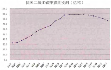 2009年我國提出到2020年單位國內生產總值二氧化碳排放比2005年下降40%~45%的發展目標。假定目標能夠實現,結合我國今后一段時期GDP增長率7%的假設(假設依據來自我國政府的宏觀經濟發展目標),測算今后一段時期我國二氧化碳排放數量,預測結果顯示(見下圖),2015年以前我國碳排放量將維持在一個固定的水平,排放規模大約在88億噸,2017年之后才有可能出現緩慢下降趨勢。