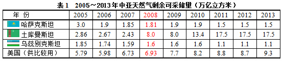全球天然氣富集地區在中東的波斯灣和俄羅斯的亞馬爾半島,中亞不能說是天然氣富集地區,中亞天然氣資源主要在3個國家:哈薩克斯坦、土庫曼斯坦和烏茲別克斯坦,其中土庫曼斯坦儲量進展神速,2008年前,土庫曼斯坦天然氣剩余可采儲量比美國少,到2008年來了個華麗轉身,躍進世界第四位,美國落到第五位。天然氣剩余可采儲量比美國多一倍,見表1。