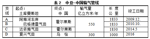 中亞—中國管線(Central Asia–China gas pipeline)由中國石油(PetroChina)與土庫曼斯坦天然氣公司(Türkmengaz)、哈薩克斯坦國家石油天然氣公司(KazMunayGas)及烏茲別克斯坦天然氣公司(Uzbekneftegaz)聯合組建。中亞輸往中國的有四條支線—A、B、C、D,見表2。起點都在土庫曼斯坦,經過烏茲別克斯坦和哈薩克斯坦抵達中國邊境霍爾果斯(huoergusi),或者經過烏茲別克斯坦、塔吉克斯坦和吉爾吉斯斯坦抵達中國邊境烏?。╓uqia)。2016年后涌往這條絲綢之路的天然氣最高可達年輸850億立方米。如果計算從土庫曼斯坦到上海,管線長達6000公里以上,可稱世界最長的管線。