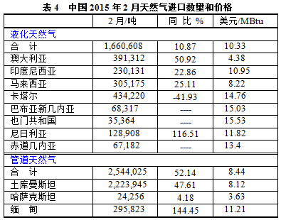 研究能源必須研究能源數據,做個簡單的計算,情況就明朗了。我們選最新的2015年2月份中國天然氣進口數據,見表4。(1噸天然氣≈1360立方米)