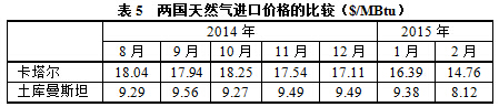 卡塔爾和土庫曼斯坦分別為世界上天然氣資源居第三和第四位,但前者以LNG供應,后者以管輸方式供應,其進口數量不一樣,價格還相差大。從表5看出,管輸天然氣比LNG的價格低。而且兩個進口價格相差近一倍,其原因是亞洲的天然氣市場結構不同、生產成本差異和運輸距離不同等造成的。