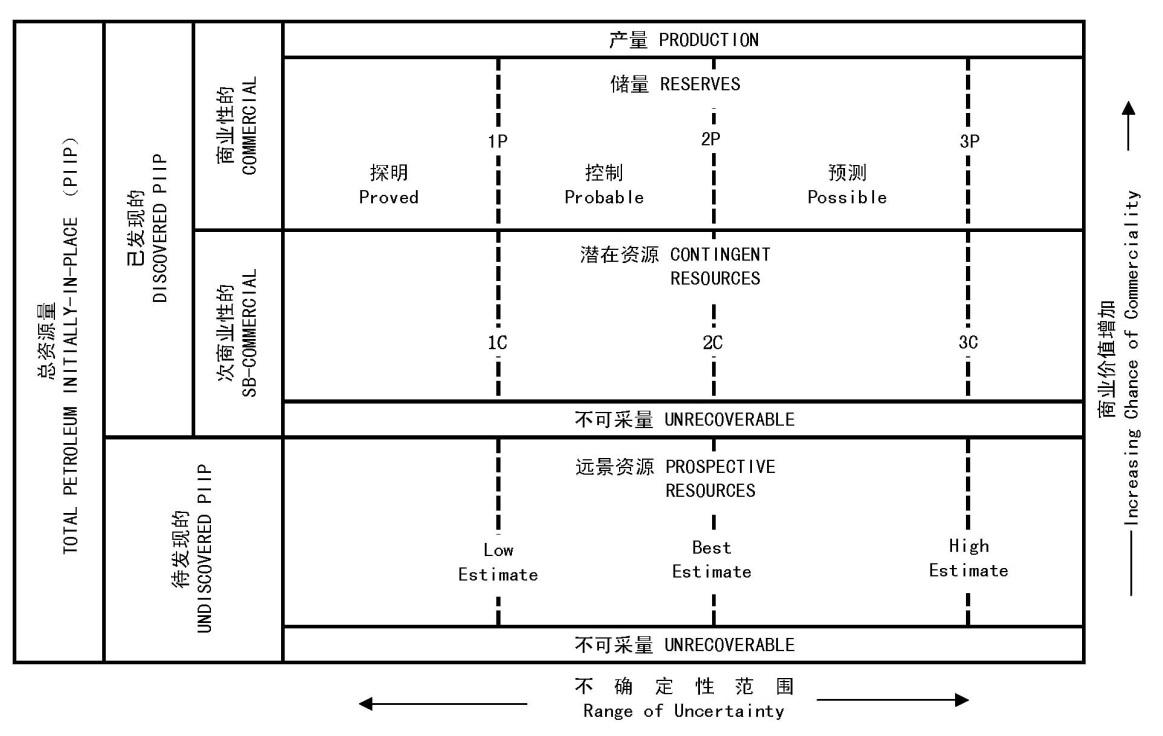 在固體礦產中經過將近二十年的實際使用,“三維分類”效果差強人意。同一時期,我國石油上游業從實際出發,并征得地礦主管部門同意,不采用該分類,按自身特點和歷史傳承,推進石油資源管理改革,因而受負面影響較小。“一切以SEC標準為準”的主張,在石油業內一度和者甚眾,但是,隨著人們對美國石油業了解加深;SEC“儲量”確定手段中采納了地震方法,在儲量價值計算中改進油價取值方法;尤其是經過多年努力,美國石油地質家協會(AAPG)、石油工程師協會(SPE)、石油評估師協會(SPEE)和世界石油委員會(WPC)于2007年,聯合推出了一個石油資源管理系統(Petroleum Resources Management System,簡稱 “PRMS” ) (圖2),進一步證明“一切以SEC標準為準”,否定“地質儲量”作用,貶低我國歷史傳統的主張,不符合中外石油業的實際和發展趨勢,是只見樹木不見森林,靜止地對待事物[7]。“頁巖氣熱”一定程度地干擾了我國石油業發展,由于一、二輪全國頁巖氣區塊招標[8],將業外企業和民企一下子引入到十分困難的領域,示范效果不佳,使后續改革,走“眾人拾柴火焰高”的發展道路增添了困難。而且“十二五”期間,我國境外油氣資產中,頁巖油氣等非常規資源的占比中急劇膨脹,在應對本輪“低油價”中成了沉重的包袱。