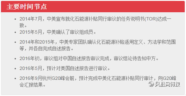 隨后,中美借鑒G20公布的同行審議流程和方法學(Methodology for G-20 Voluntary Peer Reviews on Inefficient Fossil Fuel Subsidies That Encourage Wasteful Consumption),同時根據兩國情況開展工作。這其中的主要時間節點包括: