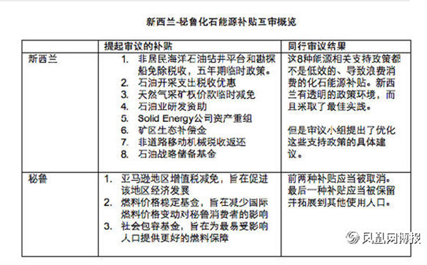 國家間的化石能源補貼同行審議并非G20獨創,在APEC框架下已經成功完成了一例互審(新西蘭-秘魯)。通過審視秘魯和新西蘭分別于2014年11月和2015年9月提交的結果,我們或許可以從中窺見中美互審的可能結果。