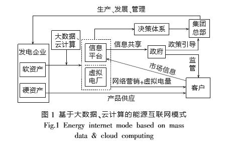 如圖1所示,基于大數據和云計算的能源互聯網,由政府、發電集團總部、基層發電企業、客戶四大主體和信息平臺、虛擬電廠、決策體系三大信息系統構成,而構成整個網絡系統的基礎是大數據與云計算的應用。發電企業的軟資產經過大數據分析與云計算,通過互聯網形成信息平臺和虛擬電廠。信息平臺可以為客戶提供電力生產、經營信息,供客戶了解不同區域、不同時段的電量水平、發電能力、電力價格等供給信息;同時,客戶將當地電網負荷、電網運行方式、競價準則、輔助服務等市場需求信息反饋至信息平臺,從而形成發電市場供給與需求的信息共享平臺。信息共享平臺又將市場供需情況提供給政府,作為政府制定各項政策的參考,用以引導發電集團和監管用電客戶。虛擬電廠是將電廠的建設、生產、運營等情況進行網絡實時模擬,并且可以通過網絡進行遠程監控、操作、維護、維修;同時,虛擬電廠通過模擬生產出來的電量,可以經網絡向客戶提供,由客戶通過網絡進行預訂、選購,必要時可以存儲在虛擬電廠之中,當需要時在現實生產中提取,形成虛擬電量銀行。信息平臺、虛擬電廠通過與政府、客戶的共享、互動,形成一套完整的決策體系,供集團總部用于管理決策,用以指導發電企業生產、發展及管理。