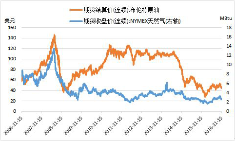圖1 2006年以來布倫特原油和NYMEX天然氣價格走勢