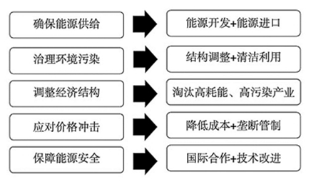 通過具體分析,筆者認(rèn)為能源革命目標(biāo)的先后順序依次為確保能源供給、治理環(huán)境污染、調(diào)整經(jīng)濟(jì)結(jié)構(gòu)、應(yīng)對(duì)價(jià)格沖擊、保障能源安全。
