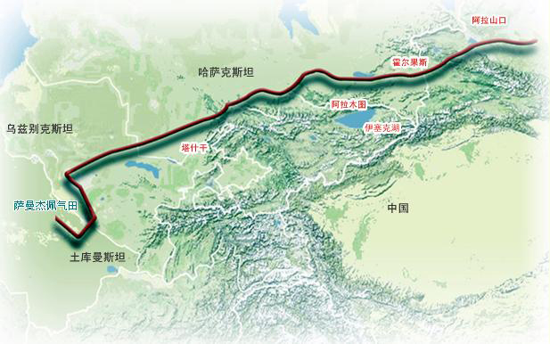中國-中亞天然氣管道西起土庫曼斯坦與烏茲別克斯坦邊境,穿越烏茲別克斯坦中部和哈薩克斯坦南部地區,在中國新疆的霍爾果斯入境。管道全長1800多公里,雙線并行。此次天然氣管道率先單線通氣,2010年將實現雙線通氣。項目全面竣工后,在30年的運營期內,每年將從中亞地區向中國穩定輸送約300億立方米的天然氣,相當于2007年我國國內天然氣總產量的一半左右。