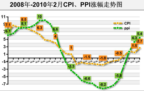 2010年2月CPI同比上漲2.7% PPI漲5.4%