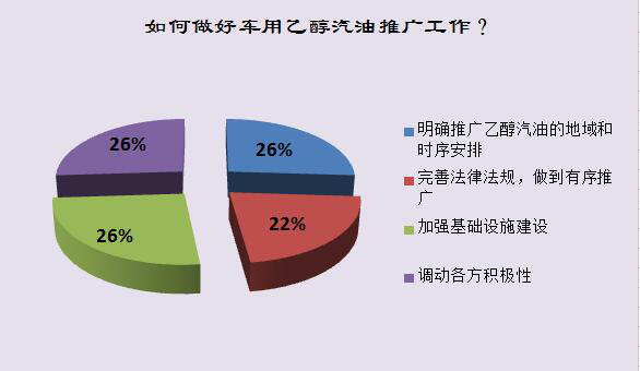 大部分受訪者認為,明確推廣乙醇汽油的地域和時序安排;完善法律法規,做到有序推廣;加強基礎設施建設;調動各方積極性,這四個選項都對車用乙醇汽油的推廣工作起到關鍵作用。