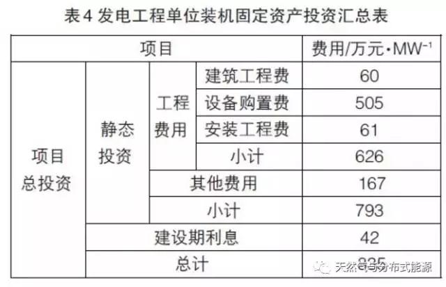 根據上述測算,分布式供能項目發電工程靜態投資為793萬元/MW,資金籌措方案按資本金20%,銀行貸款80%考慮,建設期兩年,第一年貸款比例為50%,第二年為50%,貸款利率為6.55%,則單位裝機建設期利息為42萬元/MW。