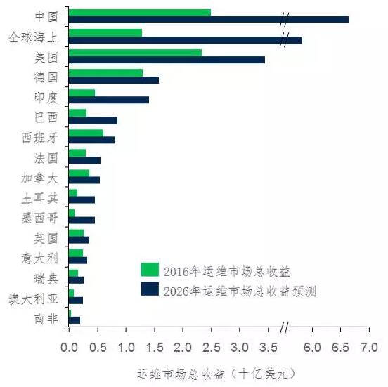 從下圖1可見,歐洲運(yùn)維市場(chǎng)仍為2016年市場(chǎng)價(jià)值最為集中的區(qū)域,風(fēng)機(jī)吊裝歷史悠久、運(yùn)維成本也相對(duì)較高。從下圖2可見,中國市場(chǎng)大量的吊裝項(xiàng)目將促使中國登頂2026年運(yùn)維市場(chǎng)收益之最,約美元67億。未來十年,美國、德國、印度、巴西與西班牙市場(chǎng)也將憑借大量的吊裝風(fēng)機(jī)體量成為全球最具運(yùn)維市場(chǎng)機(jī)遇與價(jià)值的區(qū)域。