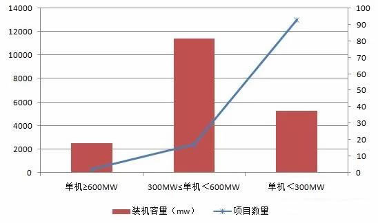 從新核準項目單臺機組發電容量來看,單機容量超過600兆瓦的項目只有2個,分別位于山東和內蒙;單機容量小于300兆瓦的項目有93個,數量最多。
